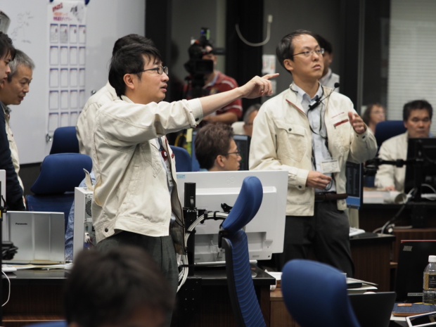 「はやぶさ2」MASCOT分離運用(2)(2018/10/3) ミッション:はやぶさ2 タイプ:写真 掲載日:2018/10/03 天体名:小惑星リュウグウ クレジット:ISAS/JAXA ダウンロード: 5184×3888px [8 MB] シェア ツイート 日中の運用担当スタッフが集合し、シフト交代時のフリーフィングを行っている様子。 このスタッフがMASCOT分離時の運用も担う。 撮影日:2018年10月3日 7:30頃 撮影場所:JAXA宇宙科学研究所 管制室内