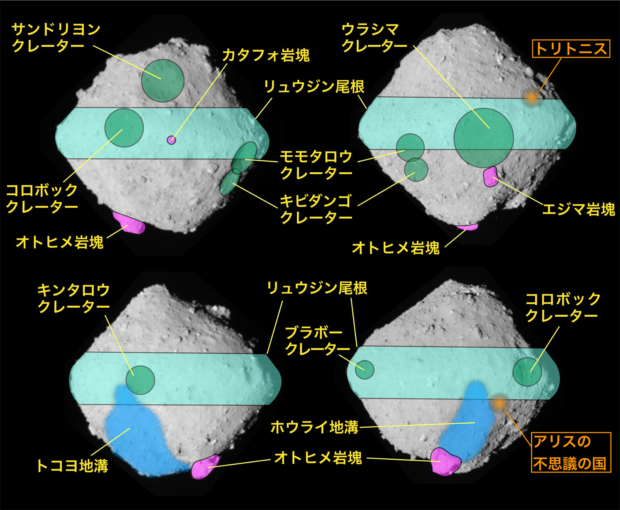 リュウグウ表面の地名(球体表示) ミッション:はやぶさ2 タイプ:観測 掲載日:2019/01/08 天体名:小惑星リュウグウ クレジット:JAXA ダウンロード: 1500×1235px [352 KB] シェア ツイート 注:トリニトスとアリスの不思議の国 は、それぞれMINERVA-II1と MASCOT着陸地点のニックネー ムで、IAUに認められた地名で はない。 関連リリース 小惑星探査機「はやぶさ2」の記者説明会(19/1/8) リュウグウ表面の地名が決定!(はやぶさ2プロジェクト)
