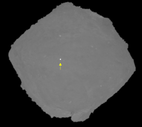 衝方向(位相角が0度)から撮影されたリュウグウ。 望遠の光学航法カメラ(ONC-T)を使って、2019年1月8日、19:12(日本時間)頃に撮影。矢印の先の白い点がターゲットマーカ。リュウグウまでの距離は約20km。