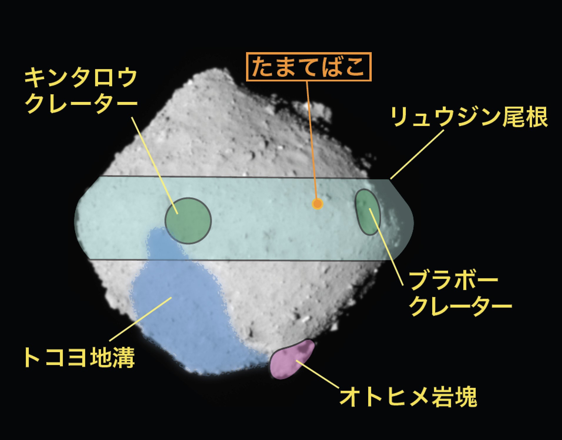 「はやぶさ2」タッチダウン地点のニックネーム(愛称) ミッション:はやぶさ2 タイプ:写真 掲載日:2019/03/05 天体名:小惑星リュウグウ クレジット:JAXA ダウンロード: 1911×1498px [204 KB] シェア ツイート 「はやぶさ2」がタッチダウンした地点のニックネーム(愛称)をたまてばこ(Tamatebako)とした。(注:国際天文学連合に登録する正式名称ではない。) リュウグウ地名地図(改訂版) 注:トリニトス(MINERVA-II1の着陸地)、アリスの不思議の国(MASCOT着陸地)、たまてばこ(1回目のタッチダウン地点)はニックネーム(愛称)で、国際天文学連合(IAU)に認められた地名ではない。 他の地名はIAUで認められた正式名称である。 関連リリース 小惑星探査機「はやぶさ2」記者説明会資料(2019/3/5)