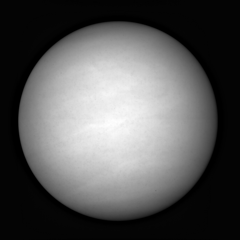 IR1(1μmカメラ)が2016年5月7日03:01頃に撮影した波長0.90μmの金星昼面画像。一見のっぺりしているが、画像の強調処理を行うと細かな雲の模様が見えてくる。そうした模様は雲頂より数km下の構造であると考えられている。模様を見やすくする処理、中央のラインの不具合を修正する処理を施している。高度65,000kmから撮影。 © ISAS/JAXA