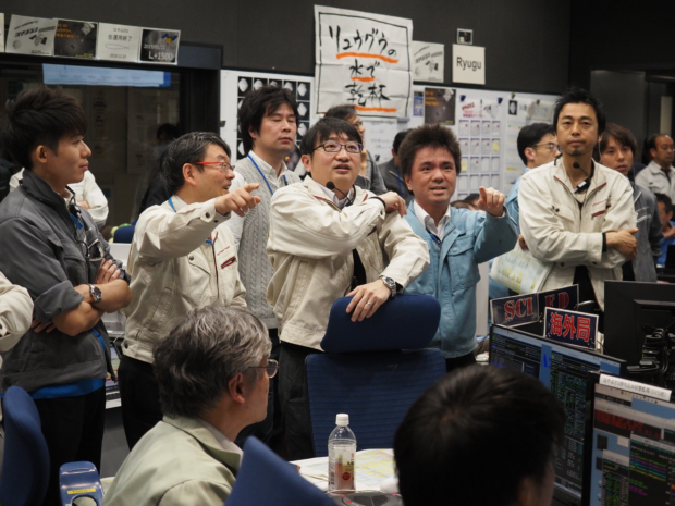「はやぶさ2」衝突装置運用 SCIの分離を確認(2019/4/5) ミッション:はやぶさ2 タイプ:写真 掲載日:2019/04/05 天体名:小惑星リュウグウ クレジット:ISAS/JAXA ダウンロード: 4934×3701px [8 MB] シェア ツイート 撮影時刻:日本時間2019年4月5日 11:13頃 撮影場所:JAXA宇宙科学研究所 管制室内 内容:地上でSCI(Small Carry-on Impactor)分離を確認したころの管制室内の様子。