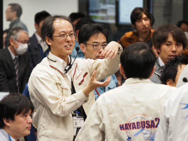 「はやぶさ2」衝突装置運用 SCIの分離とDCAM3の分離を確認(2019/4/5) ミッション:はやぶさ2 タイプ:写真 掲載日:2019/04/05 天体名:小惑星リュウグウ クレジット:ISAS/JAXA ダウンロード: 5184×3888px [8 MB] シェア ツイート 撮影時刻:日本時間2019年4月5日 11:13頃から11:50頃 撮影場所:JAXA宇宙科学研究所 管制室内 内容:地上でSCI(Small Carry-on Impactor)分離を確認、退避マヌーバのようすを注視している。DCAM3の分離も確認、DCAM3との通信も確立した。