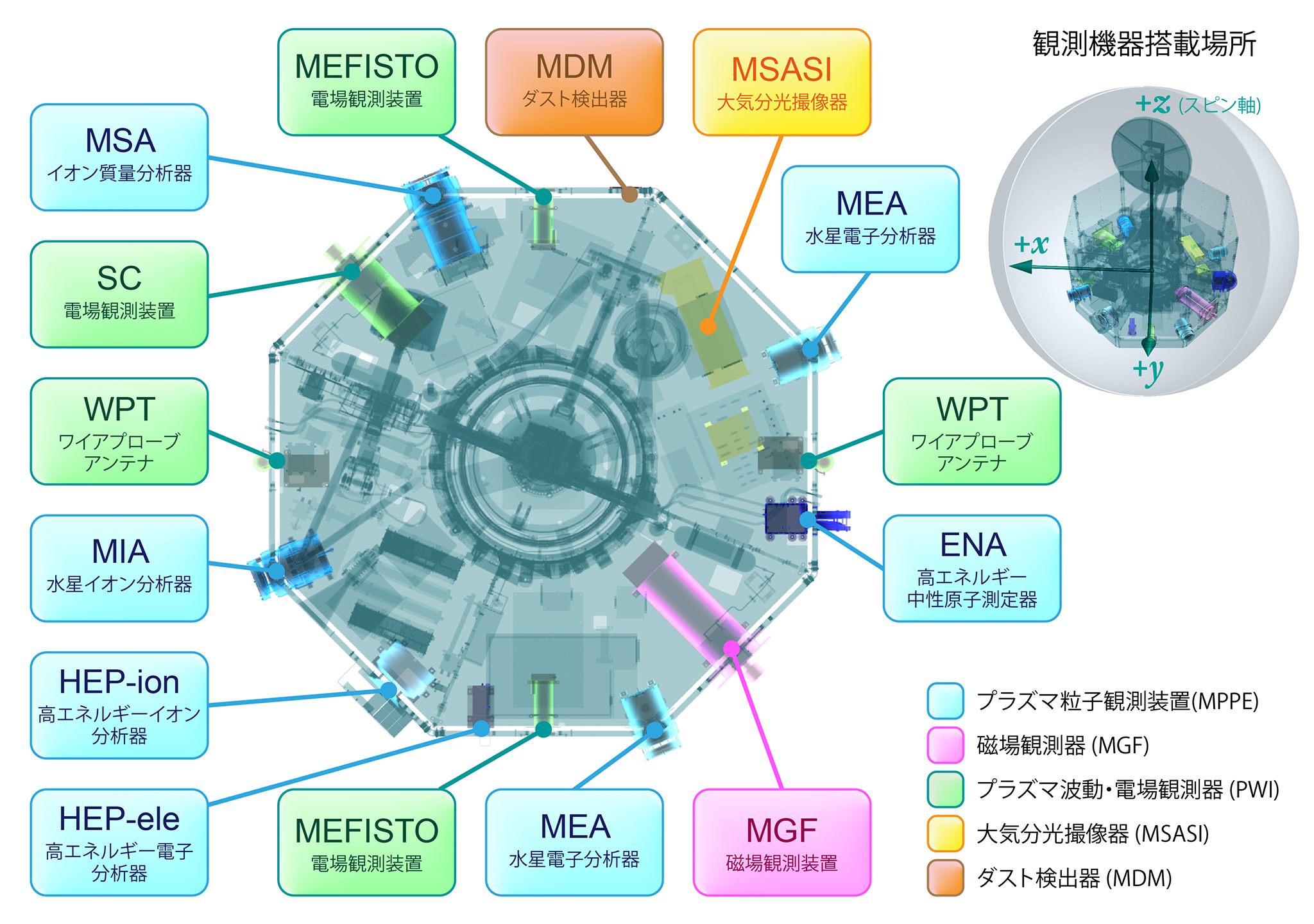 BepiColombo計画水星磁気圏探査機「みお」(MMO)の搭載装置一覧(イメージ図) ミッション:みお タイプ:イラスト 掲載日:2018/09/10 天体名:水星 クレジット:JAXA ダウンロード: 2048×1440px [1 MB] シェア ツイート 内容 : ベピコロンボ(BepiColombo)計画はESA担当の水星表面探査機(MPO:Mercury Planetary Orbiter)とJAXA担当の水星磁気圏探査機(MMO:Mercury Magnetospheric Orbiter)の2機による大型ミッションです。 利用可能範囲 : 報道・教育・商業目的使用可能 関連リリース 国際水星探査計画「BepiColombo」/水星磁気圏探査機「みお」(MMO) 水星磁気圏探査機「みお」