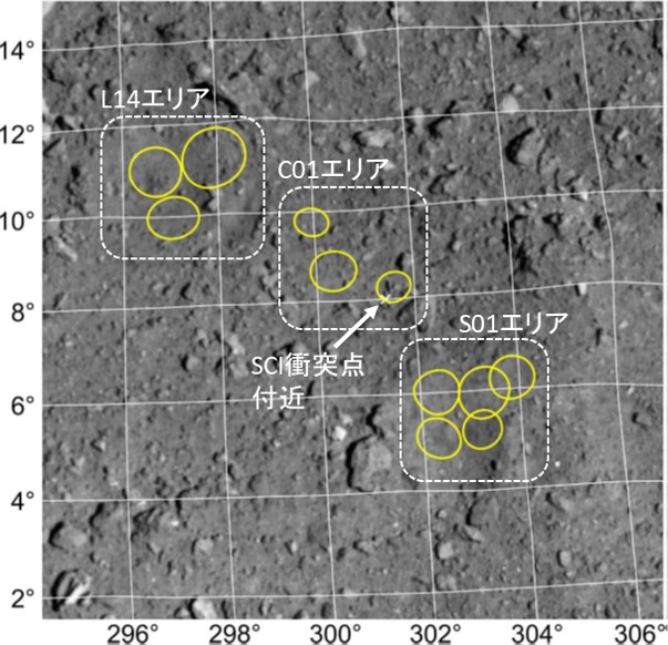「はやぶさ2」クレーター探索運用(事後)[CRA2]後のタッチダウン候補地点 ミッション:はやぶさ2 タイプ:写真 掲載日:2019/05/09 天体名:小惑星リュウグウ クレジット:JAXA ダウンロード: 603×582px [93 KB] シェア ツイート (文字なし) クレーター探索運用(事後)[CRA2]後のタッチダウン候補地点 •C01は人工クレータが作られたエリア •S01は事前に今年3月にバックアップ候補地点として観測していたエリア •L14はTD2の候補地点として、SCI衝突地点付近で新たに抽出されたエリア •黄色い円の領域が,現状抽出されているタッチダウン候補地点(いずれも直径6~12m) PPTD-TM1運用では、S01領域の低高度観測を行い、ターゲットマーカを投下する。 関連リリース 小惑星探査機「はやぶさ2」記者説明会資料(2019/05/09)