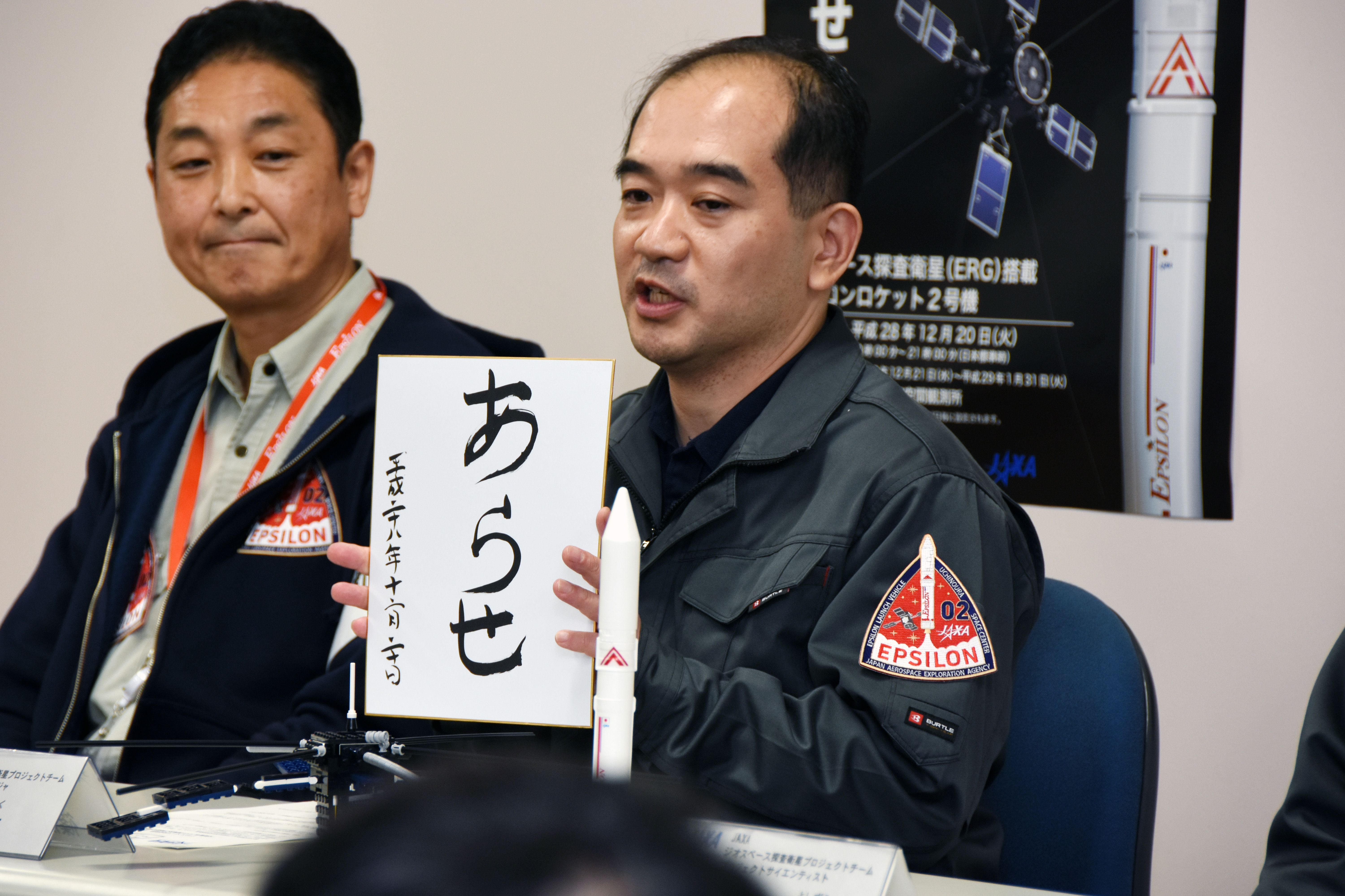 イプシロンロケット2号機 打ち上げ後会見 ミッション:あらせ タイプ:写真 掲載日:2016/12/20 クレジット:JAXA ダウンロード: 6000×4000px [4 MB] シェア ツイート イプシロンロケット2号機打ち上げ後の会見で、ジオスペース探査衛星(ERG)の愛称「あらせ」を発表する篠原育プロジェクトマネージャ。(2016/12/20)