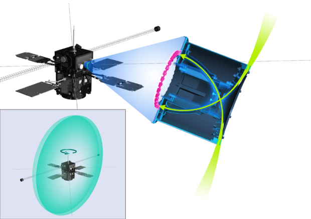 ERG衛星の粒子系観測機器の視野 ミッション:あらせ タイプ:写真 掲載日:2016/12/21 クレジット:ERG science team ダウンロード: 3512×2480px [1 MB] シェア ツイート ERG衛星の姿勢は衛星自体が回転するスピン安定方式です。このため、スピン周期ごとに、あらゆる方向に視野を向け、粒子の情報を集めることが可能となります。