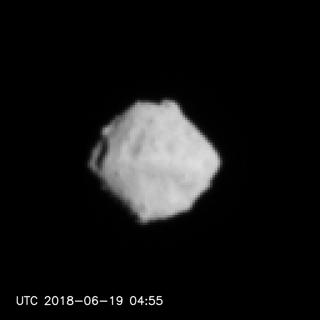 「はやぶさ2」ONC-Tによって撮影されたリュウグウ(8)(2018/6/19) ミッション:はやぶさ2 タイプ:観測 掲載日:2018/06/20 天体名:小惑星リュウグウ 観測装置:「はやぶさ2」搭載 光学航法カメラ(ONC-T) クレジット:[ONCチーム] JAXA, 東京大, 高知大, 立教大, 名古屋大, 千葉工大, 明治大, 会津大, 産総研 ダウンロード: 1024×1024px [13 KB] シェア ツイート ONC-Tによって撮影されたリュウグウ。2018年6月19日、13:55(日本時間)頃の撮影。小惑星までの距離は約152km。 (画像処理をしたもの) 関連リリース 小惑星探査機「はやぶさ2」の取得画像に関する質疑応答機会(18/06/21)