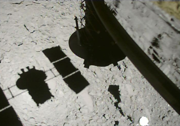 小型モニターカメラ(CAM-H)によって分離直後に撮影された画像で、ターゲットマーカは表面に向かって降下している。探査機の影の下に見える小さい黒い点はターゲットマーカの影である。 - 静止画像:撮影の時刻は2019年5月30日、11:18(機上、日本時間)で、このときの探査機の高度は約8mである。