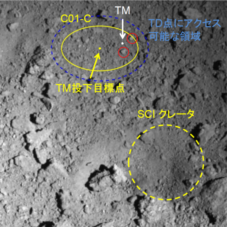 「はやぶさ2」低高度降下観測運用(PPTD-TM1A)ターゲットマーカの着地位置(2019/5/30) ミッション:はやぶさ2 タイプ:観測 掲載日:2019/06/10 天体名:小惑星リュウグウ 観測装置:「はやぶさ2」搭載 光学航法カメラ (ONC-W1) クレジット:JAXA, 東京大, 高知大, 立教大, 名古屋大, 千葉工大, 明治大, 会津大, 産総研 ダウンロード: 868×868px [334 KB] シェア ツイート 低高度降下観測運用(PPTD-TM1A) ターゲットマーカ投下 「TD(タッチダウン)点にアクセス可能な領域」へのTM投下に成功 TMはターゲットマーカの着地位置 ONC-W1によって2019年5月30日 11:23(機上、 日本時間)に撮影された画像。撮影の高度は約35mである。 関連リリース 小惑星探査機「はやぶさ2」の記者説明会(19/6/11)ライブ中継(配信)
