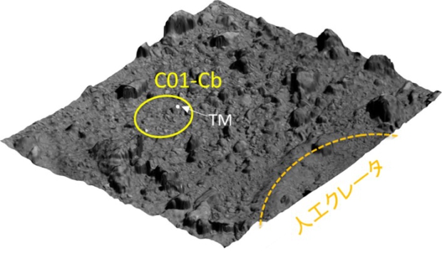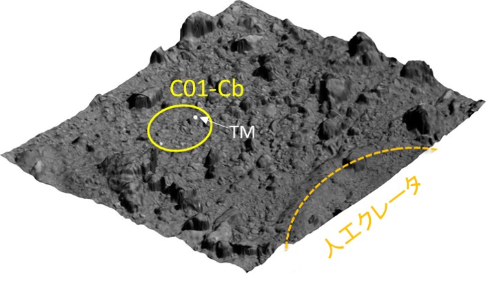 「はやぶさ2」第2回タッチダウン候補地点付近のDEM(2)(Digital Elevation Map) ミッション:はやぶさ2 タイプ:観測 掲載日:2019/06/25 天体名:小惑星リュウグウ クレジット:JAXA ダウンロード: 705×414px [56 KB] シェア ツイート タッチダウン領域 :C01-Cb (ターゲットマーカ投下領域) (文字なし) 関連リリース 2019年6月25日 記者説明会資料(はやぶさ2プロジェクト)