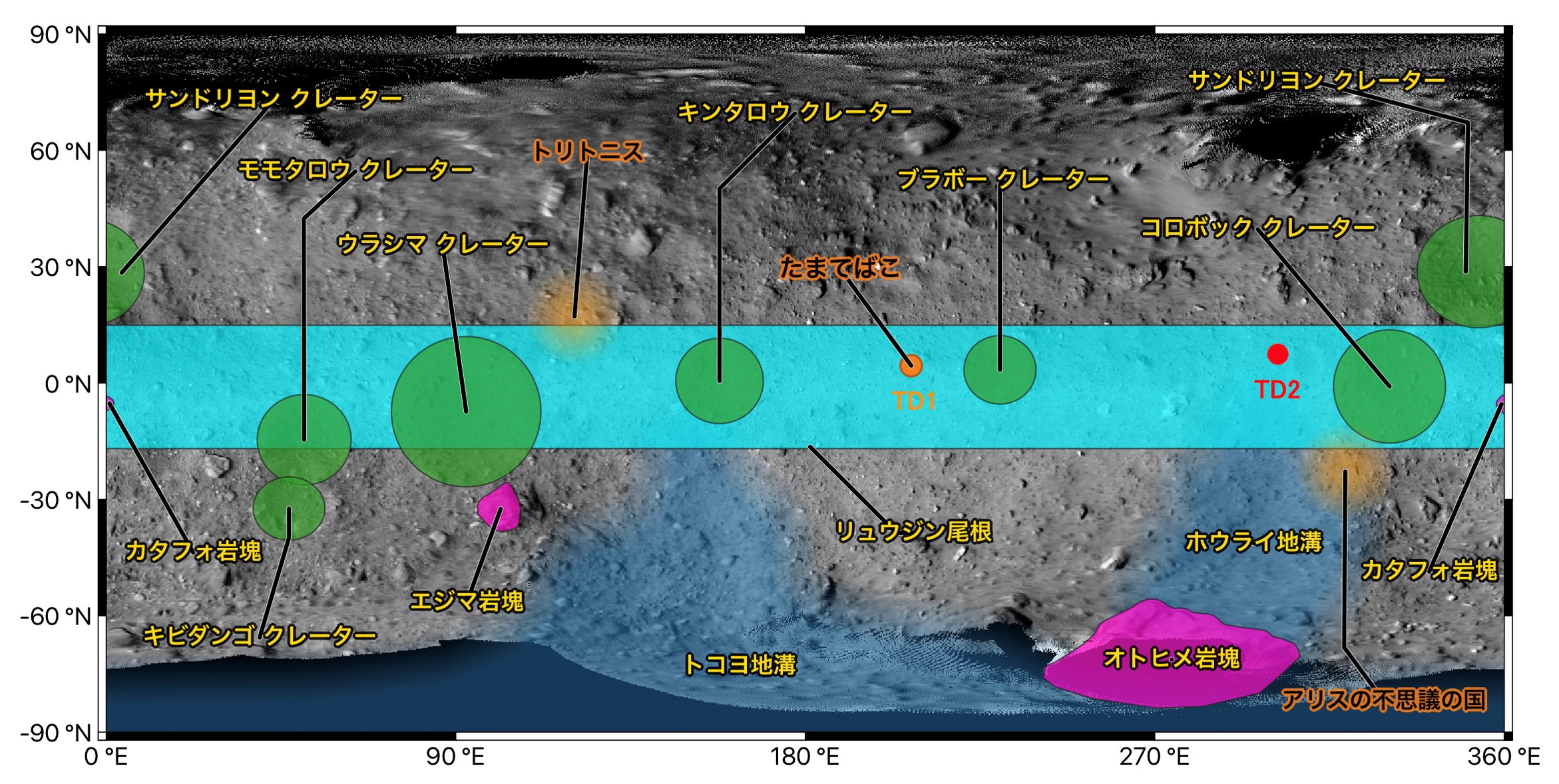 「はやぶさ2」1回目(TD1)と2回目(TD2)のタッチダウンの場所 (2) ミッション:はやぶさ2 タイプ:観測 掲載日:2019/07/09 天体名:小惑星リュウグウ クレジット:JAXA ダウンロード: 2342×1179px [696 KB] シェア ツイート 注:トリトニス(MINERVA-II1の着陸地)、アリスの不思議の国(MASCOT着陸地)、たまてばこ(1回目のタッチダウン地点)はニックネーム(愛称)で、国際天文学連合(IAU)に認められた地名ではない。他の地名はIAUで認められた正式名称である。 関連リリース 小惑星探査機「はやぶさ2」の記者説明会(19/7/9)ライブ配信