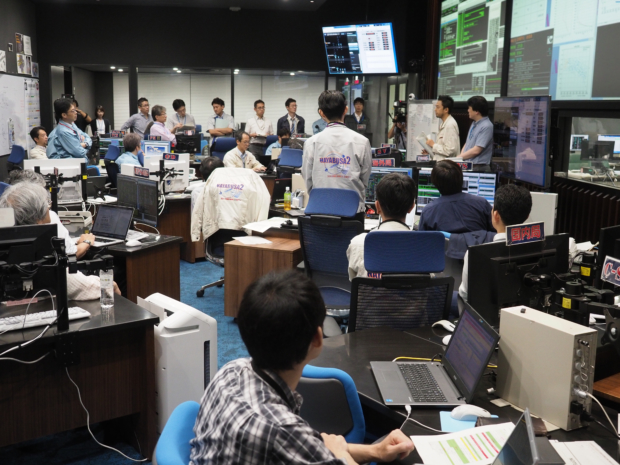 「はやぶさ2」PPTD運用 降下開始前のシフト交代ブリーフィングの様子(2019/7/10) ミッション:はやぶさ2 タイプ:写真 掲載日:2019/07/10 天体名:小惑星リュウグウ クレジット:ISAS/JAXA ダウンロード: 5184×3888px [9 MB] シェア ツイート 撮影時刻:日本時間2019年7月10日(水) 9:00頃 撮影場所:JAXA宇宙科学研究所 管制室内 内容:PPTDの予定地点に向け、「はやぶさ2」の降下開始前に運用担当者が集合し、ブリーフィングを行っている様子。