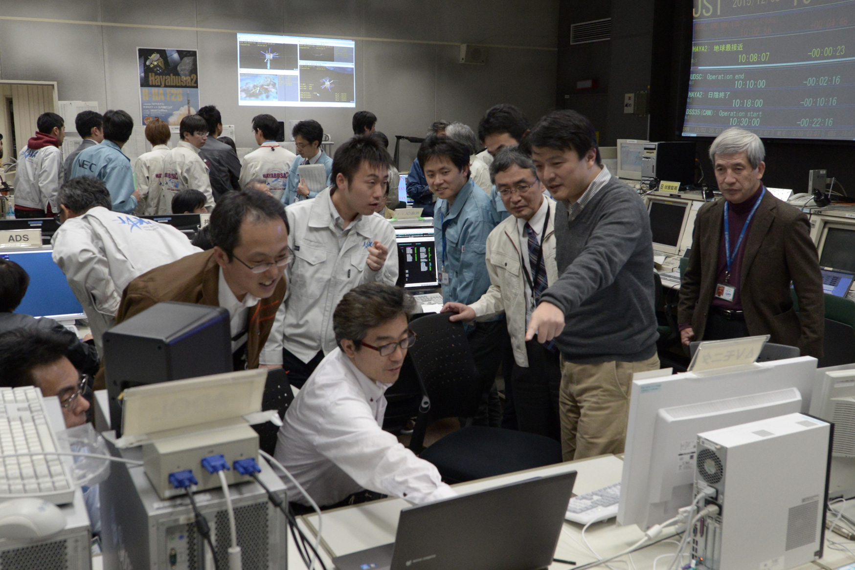 「はやぶさ2」地球スイングバイ・日陰通過頃の運用管制室の様子(2015/12/03, 19時頃) ミッション:はやぶさ2 タイプ:写真 掲載日:2015/12/03 クレジット:JAXA ダウンロード: 1748×1167px [531 KB] シェア ツイート 「はやぶさ2」が日陰通過する頃の、運用管制室の様子 撮影場所:相模原キャンパス 補足:「はやぶさ2」は地球再接近の前後10分ずつの計20分、日陰(地球の影)を通過した。 関連リリース 小惑星探査機「はやぶさ2」の地球スイングバイ実施について(プレスリリース) 小惑星探査機「はやぶさ2」の地球スイングバイ実施結果について