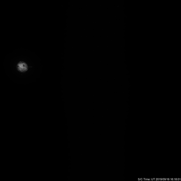 - 探査機から撮影したターゲットマーカのアニメーション。4秒間隔で撮影。最初の画像ではターゲットマーカまでの距離は約1mであるが、最後の画像では約9mである。(ターゲットマーカが降下しているのではなく、探査機が上昇することでターゲットマーカから離れていく。)