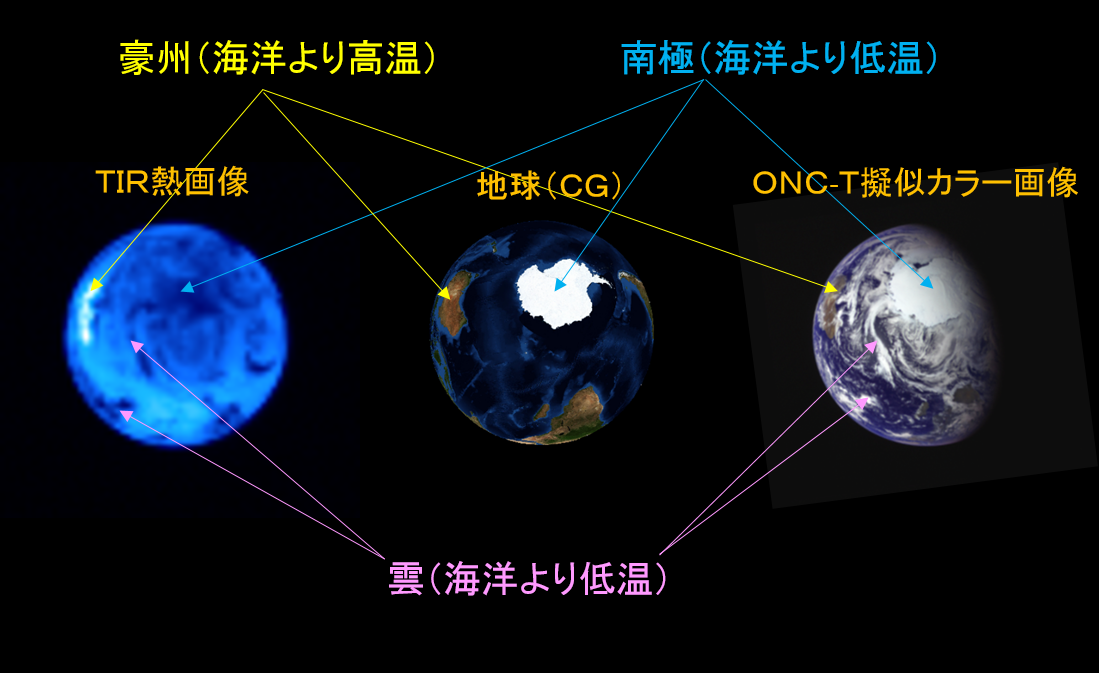 - 「はやぶさ2」搭載のTIR(中間赤外線カメラ)にて、015/12/4 13時頃(日本時間)撮像した画像とCGとONCと比較した図