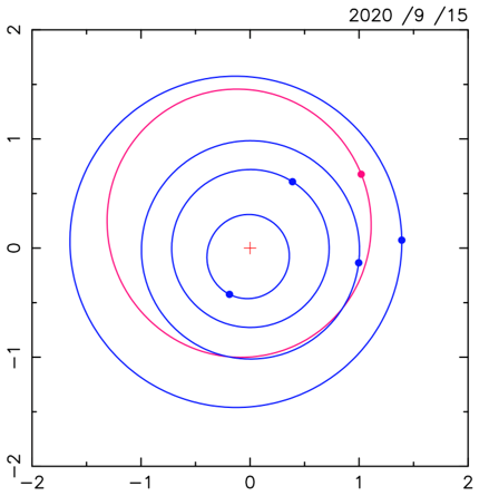 1998 KY26について(軌道図) ミッション:はやぶさ2 タイプ:イラスト 掲載日:2020/09/15 天体名:1998 KY26 クレジット:JAXA ダウンロード: 439×445px [31 KB] シェア ツイート 赤色が1998 KY26の軌道で、青色が惑星の軌道(内側から水星、金星、地球、火星)。天体の位置は、2020年9月15日現在。 (小惑星探査機「はやぶさ2」記者説明会(20/9/15)) 関連リリース 小惑星探査機「はやぶさ2」記者説明会 資料